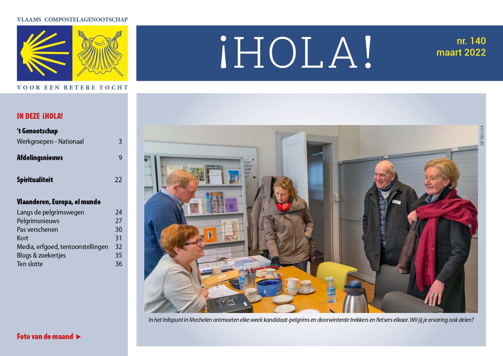 ¡HOLA! verschijnt de eerste dag van de maand, enkel als digitale publicatie. Leden krijgen de nieuwsbrief toegestuurd via e-mail. De nieuwsbrief brengt zowel nieuws van het Vlaams Compostelagenootschap als nieuws uit de ruime pelgrimswereld. ¡HOLA! besteedt aandacht aan de pelgrimswegen, transport, logies, gidsen en andere publicaties, erfgoed, tentoonstellingen en veel meer. ¡HOLA! publiceert ook lezersbrieven en zoekertjes van leden en verwijst naar interessante websites, blogs en pagina’s in de sociale media. De nieuwsbrief besteedt ook veel aandacht aan goed en veel beeldmateriaal. Ook jouw beelden zijn altijd welkom. De naam van de nieuwsbrief is het Spaanse woord voor hallo, goedendag.