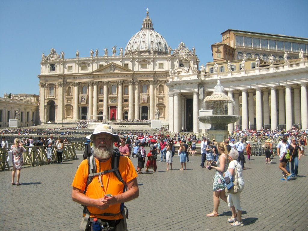 Wat later vertrekken wij voor onze laatste dag. Op de heuvels rond Rome raken we voor het eerst de weg kwijt. In de hoop een glimp van de Sint-Pietersbasiliek op te vangen, lopen we door de heuvels rond de stad. We zien weliswaar koepels van alle maten, maar niet dé koepel. Tot het lukt en een uur later staan we op het grote plein, met onze rugzakken. Dat hadden we nooit verhoopt. Wij dachten dat we uit veiligheidsoverwegingen niet met rugzakken op het plein zouden mogen komen. In een kantoortje op het plein halen we ons ‘testimonium’ (‘compostela’) op en fier als een gieter gaan we op de foto. Alweer een fijne ervaring rijker.