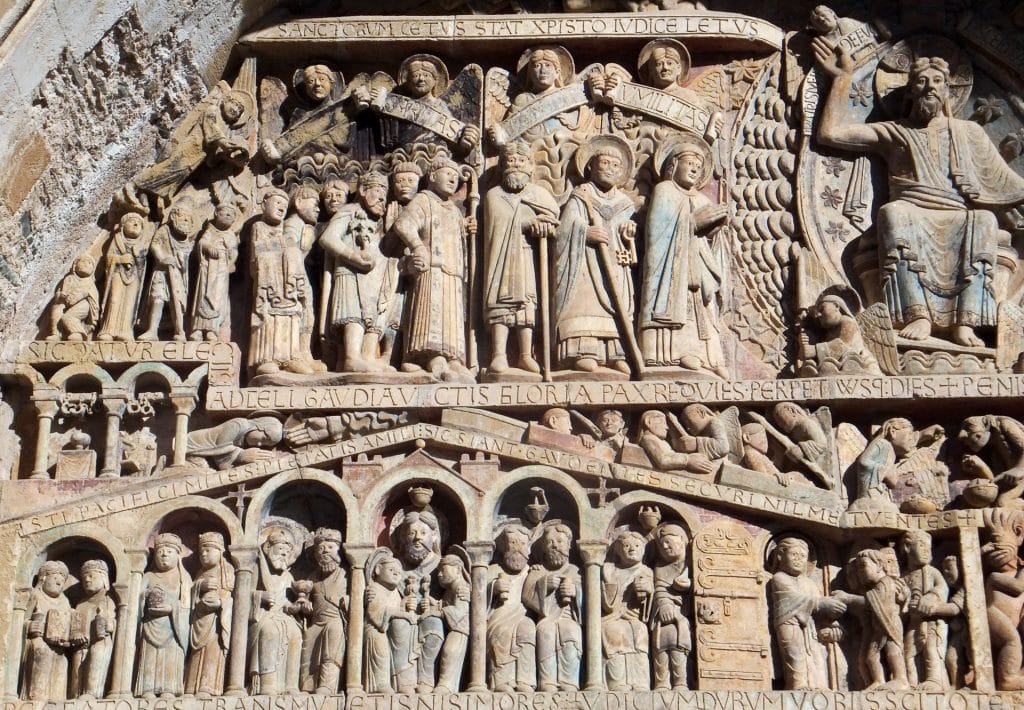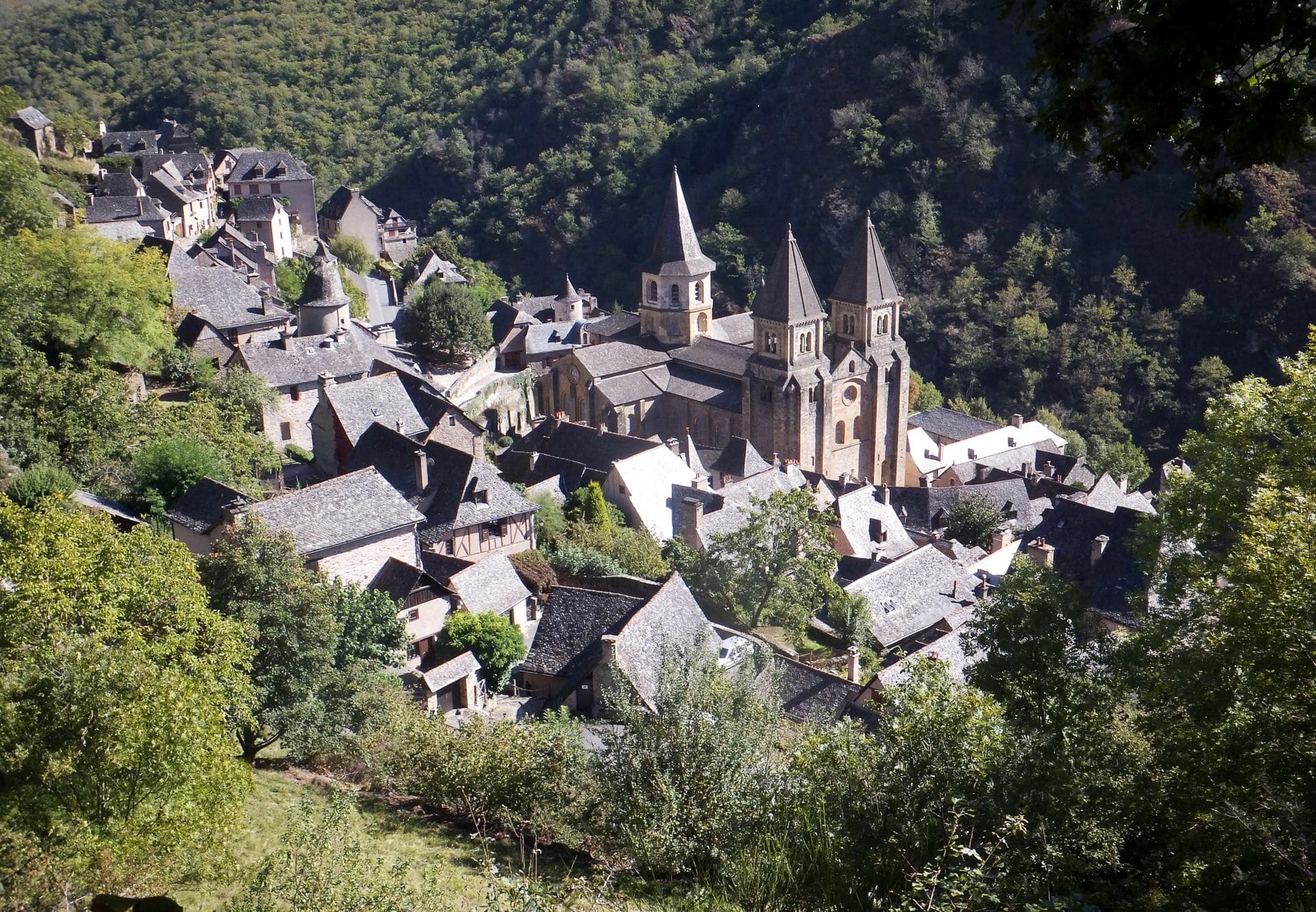 De aankomst in Conques maakt een onvergetelijke indruk de plek heeft me direct in zijn ban. De grote norbertijnenabdij van Sainte-Foy, gelegen vlak achter de imposante abdijkerk, biedt volop slaapgelegenheid en verrijkende contacten met andere pelgrims. Na het vertrek van de toeristen is het er muisstil. Ik blijf nog een dag in Conques en neem deel aan een rondleiding met uitgebreide uitleg over het goed bewaarde timpaan van de abdijkerk, waarop Het Laatste Oordeel wordt afgebeeld, en de tribunes (galerijen op de verdieping van de kerk), van waaruit je een aantal van de 250 romaanse kapitelen van dichterbij kan bekijken. De nieuwe gebrandschilderde ramen werden eind jaren tachtig ontworpen door de Franse schilder Pierre Soulages. Ze veranderen van kleur naargelang de lichtinval. In het Musée Soulages in Rodez kom je alles te weten over het ontwerp en de uitwerking van de ramen. Het museum naast de kerk bevat de kerkschatten, waaronder het schitterende vergulde beeld van Sainte-Foy. Vanaf de Chapelle Saint-Roch heb je een prachtig uitzicht op Conques. ’s Avonds is er de pelgrimszegen in de kerk, met aansluitende misviering. De mooie orgelmuziek die resoneert in de grootse, stemmig verlichte kerk is overweldigend. Op het einde van de viering gaan alle pelgrims rond het altaar staan en houden elkaars hand vast bij het zingen van het ‘Salve Regina’. Dit is voor velen duidelijk een ontroerend moment.