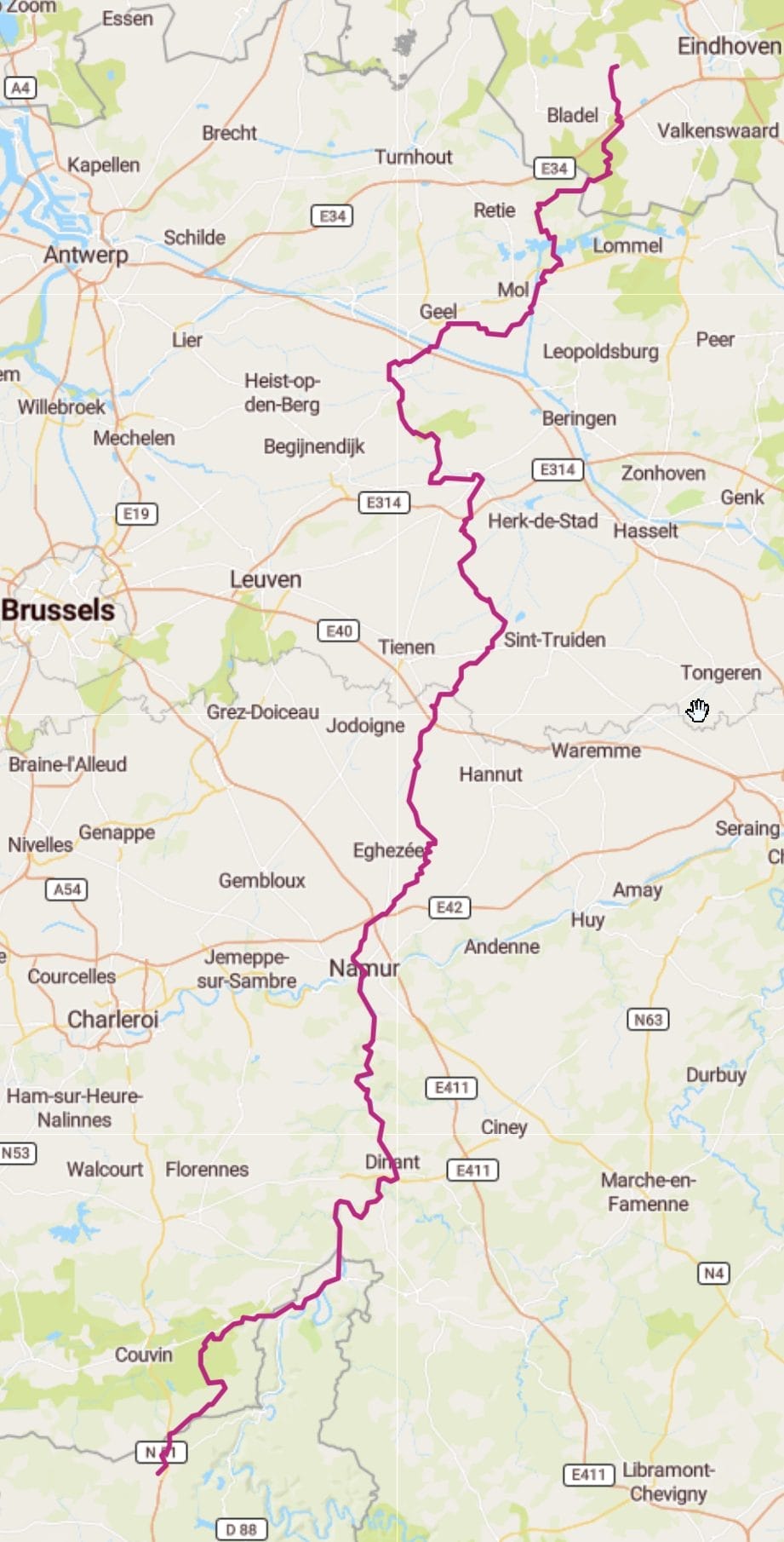 Niet te missen in Namen is de schat van Hugo van Oignies in het TreM.a, een schat met o.a. een voetreliek van Jakobus. Vanaf Namen tot voorbij Givet volgt de Via Monastica een voor de hand liggende leidraad: de Maas. Soms is dat een breed jaagpad, soms een wat avontuurlijker pad, zoals het stuk vanaf de rotsen van Freÿr tot bijna in Hastière. Bouvignes is een mooi dorp langs de Maas, met een gotische kerk inclusief een eeuwenoud pelgrimsgraf en een interessant museum. Een boogscheut verder stap je de abdij van Leffe binnen. Wil je na Dinant weg van de Maas, dan kun je kiezen voor een variante over een plateau langs de Vieux Chemin de Givet. Alle routes komen weer samen in Hastière, waar de voormalige abdijkerk al eeuwen op de pelgrimsroute ligt. Getuige daarvan de pelgrimsattributen op een ’zitterke’ in het koorgestoelte.