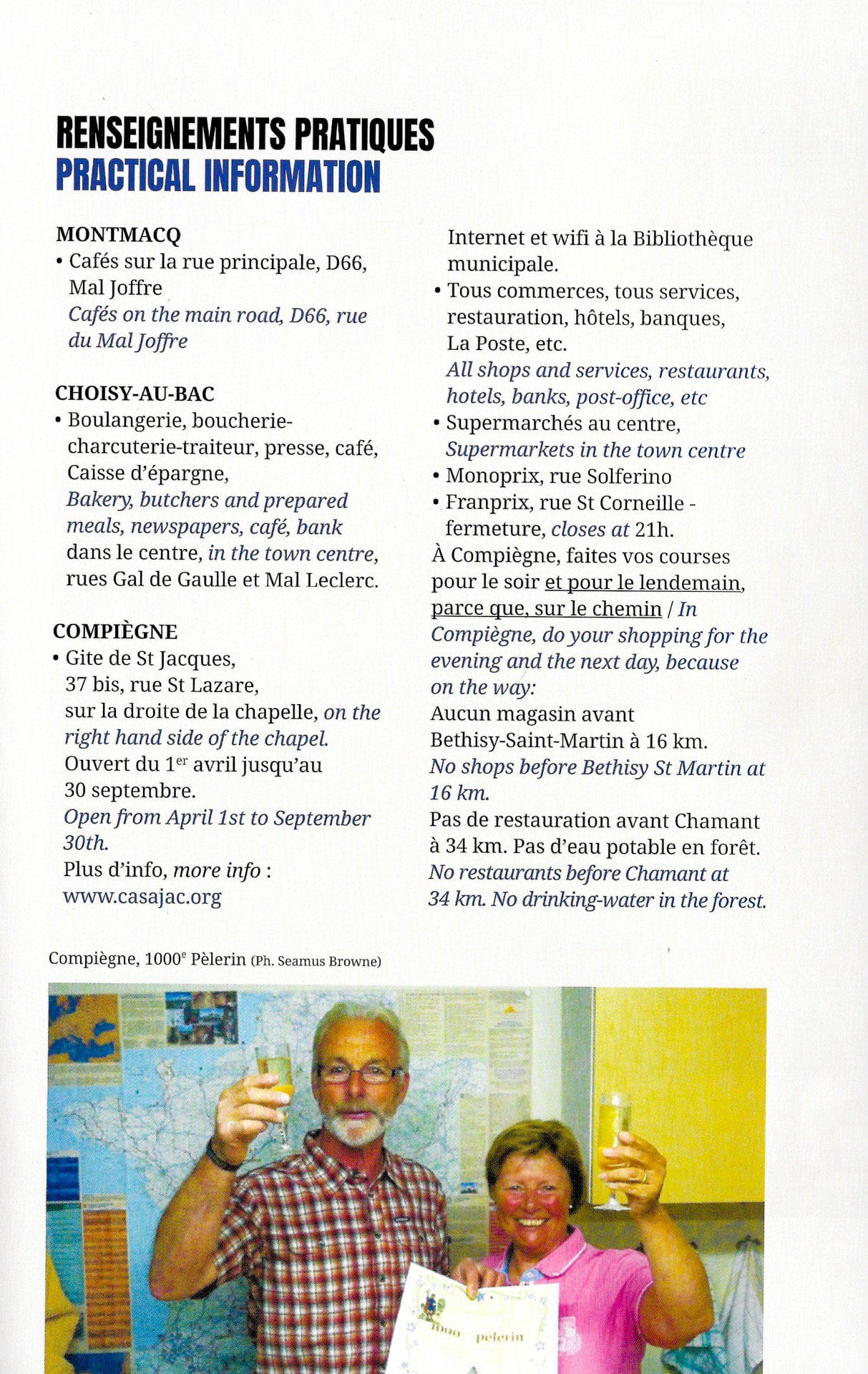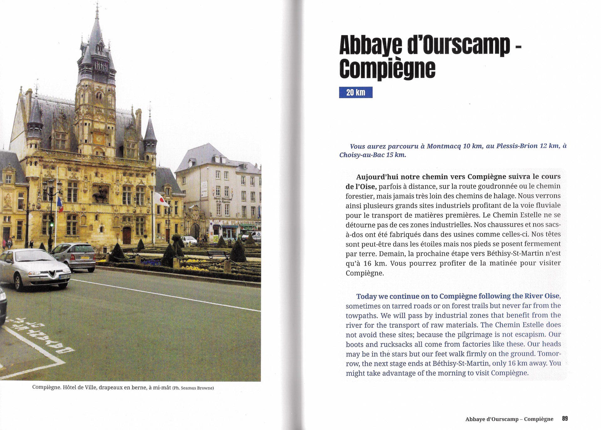 Met deze gids start de pelgrim aan de Sint-Jakobskerk in Doornik om 287 km en 12 dagetappes later te eindigen aan de Sint-Jakobstoren in hartje Parijs. Onderweg stapt de pelgrim door Cambrai, Saint-Quentin en Compiègne. Na elke etappe volgt een opsomming met overnachtingsmogelijkheden en de vermelding of er winkels en andere voorzieningen zijn. Tenslotte vermeldt de gids per traject historische en culturele feiten. De routebeschrijvingen en andere informatie wordt eerst in het Frans, daarna in het Engels weergegeven.