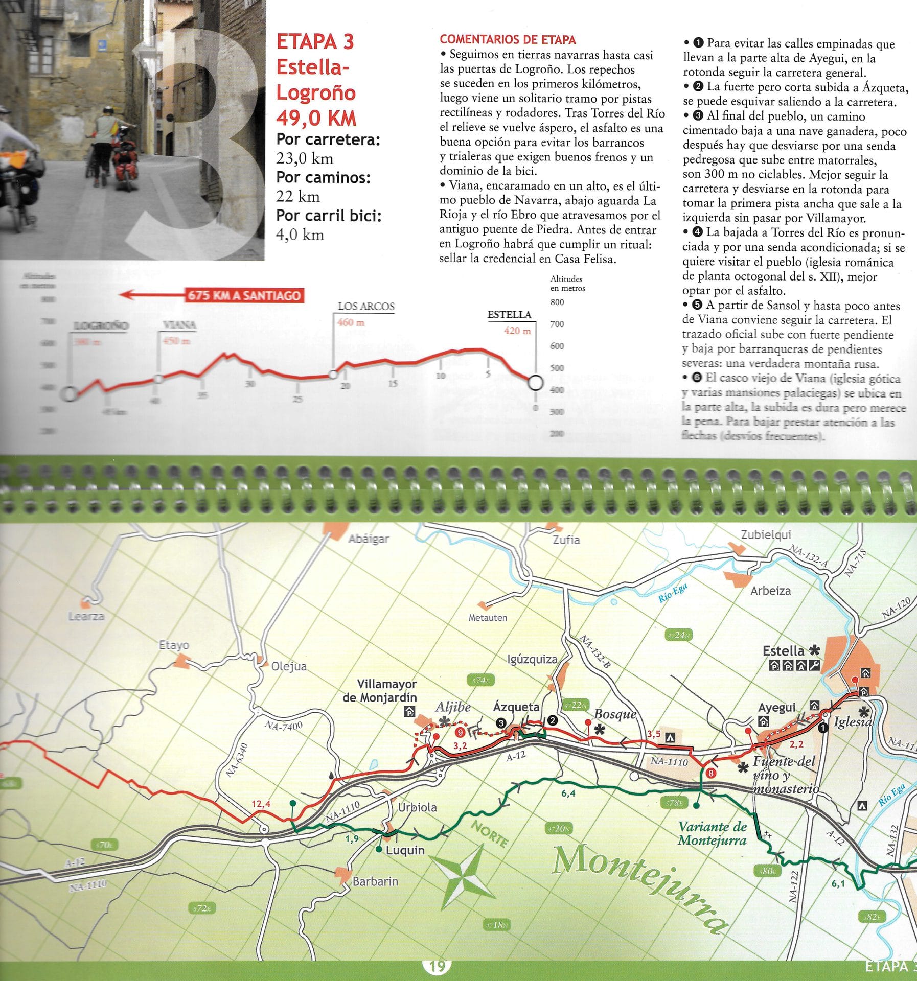 De gids beschrijft de route vanaf Saint-Jean-Pied-de-Port en eindigt aan de kathedraal van Santiago de Compostela. Hij sluit bij de start aan op de gids St. Jacobsfietsroute deel 2: Tours – Pyreneeën. De 776 km wordt verdeeld in 15 etappes, gevolgd door 3 etappes tot Fisterra (92 km) en Muxía (+29 km). Tevens beschrijft de gids een 20 tal varianten.