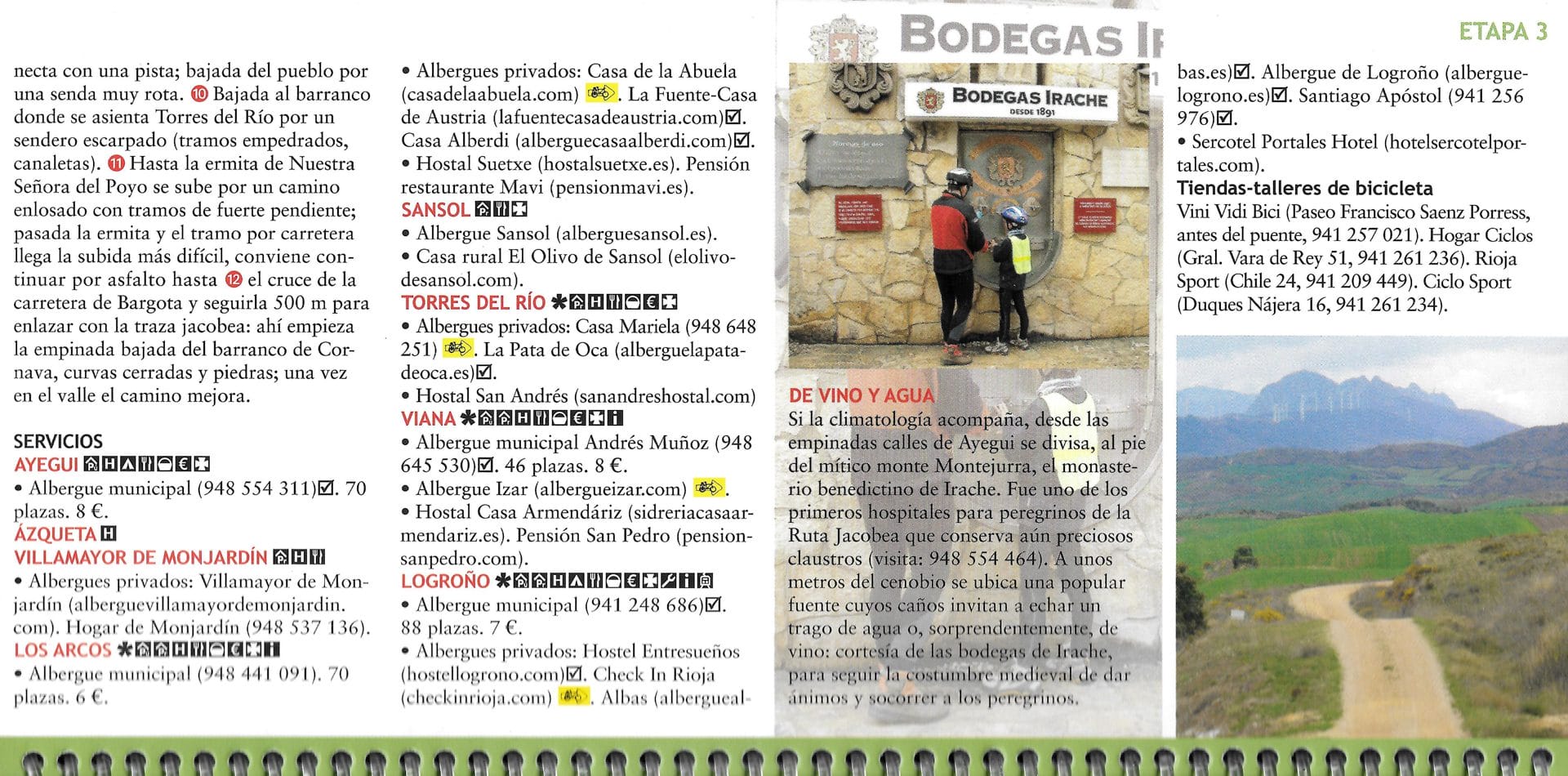 Na elke etappe volgt een opsomming per dorp van de overnachtingsmogelijkheden, winkels, bezienswaardigheden, fietswinkels en fiets-herstelplaatsen onderweg.