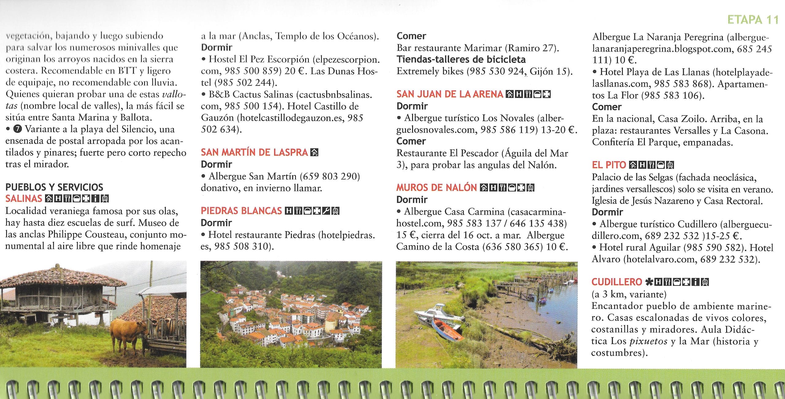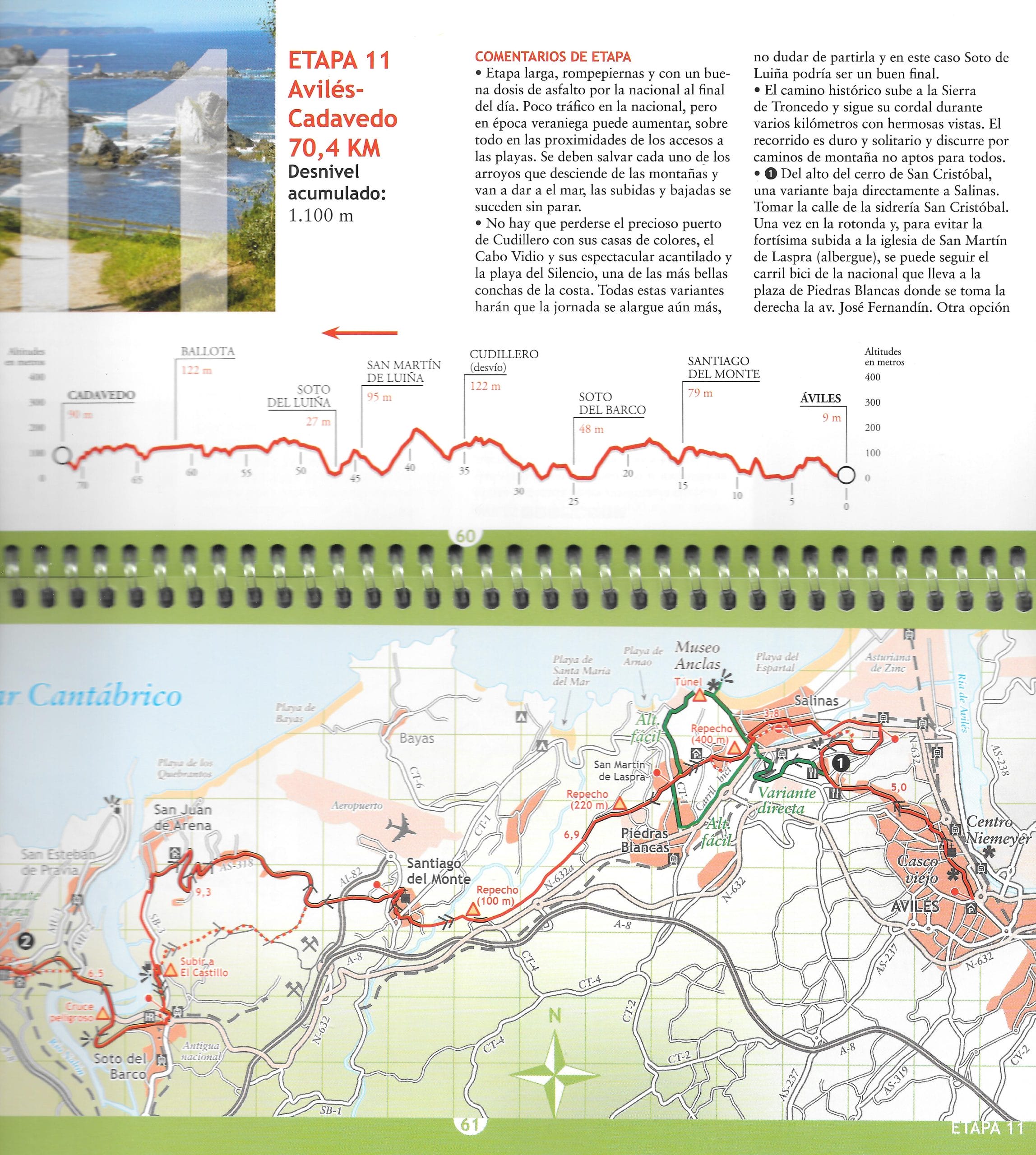 De gids verdeelt de 873 km in 16 etappes. De Camino start op de Puente de Santiago tussen Hendaye en Irún, doorkruist de grote badsteden en Bilbao, langs Gijón en Avilés tot Ribadeo. Daar draait de route naar het zuiden, richting Santiago de Compostela. Een korte variante verlengt de kustweg van Ribadeo tot Foz vooraleer zuidelijk te fietsen tot Mondoñedo.