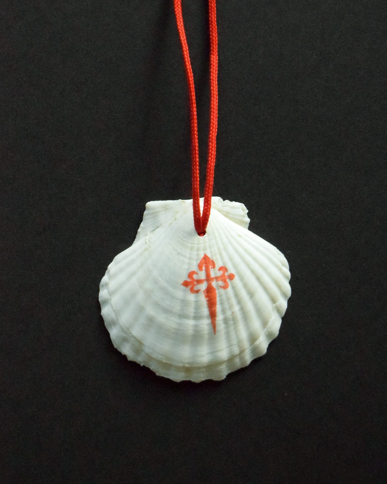Een kleine, natuurlijke Sint-Jakobsschelp aan een rood touwtje (lengte touwtje: ongeveer 70 cm). Op de schelp gedrukt: het rode kruis van de ridderorde van Sint-Jakob. De schelp geeft van oudsher aan dat je een pelgrim bent op de Camino van Santiago.