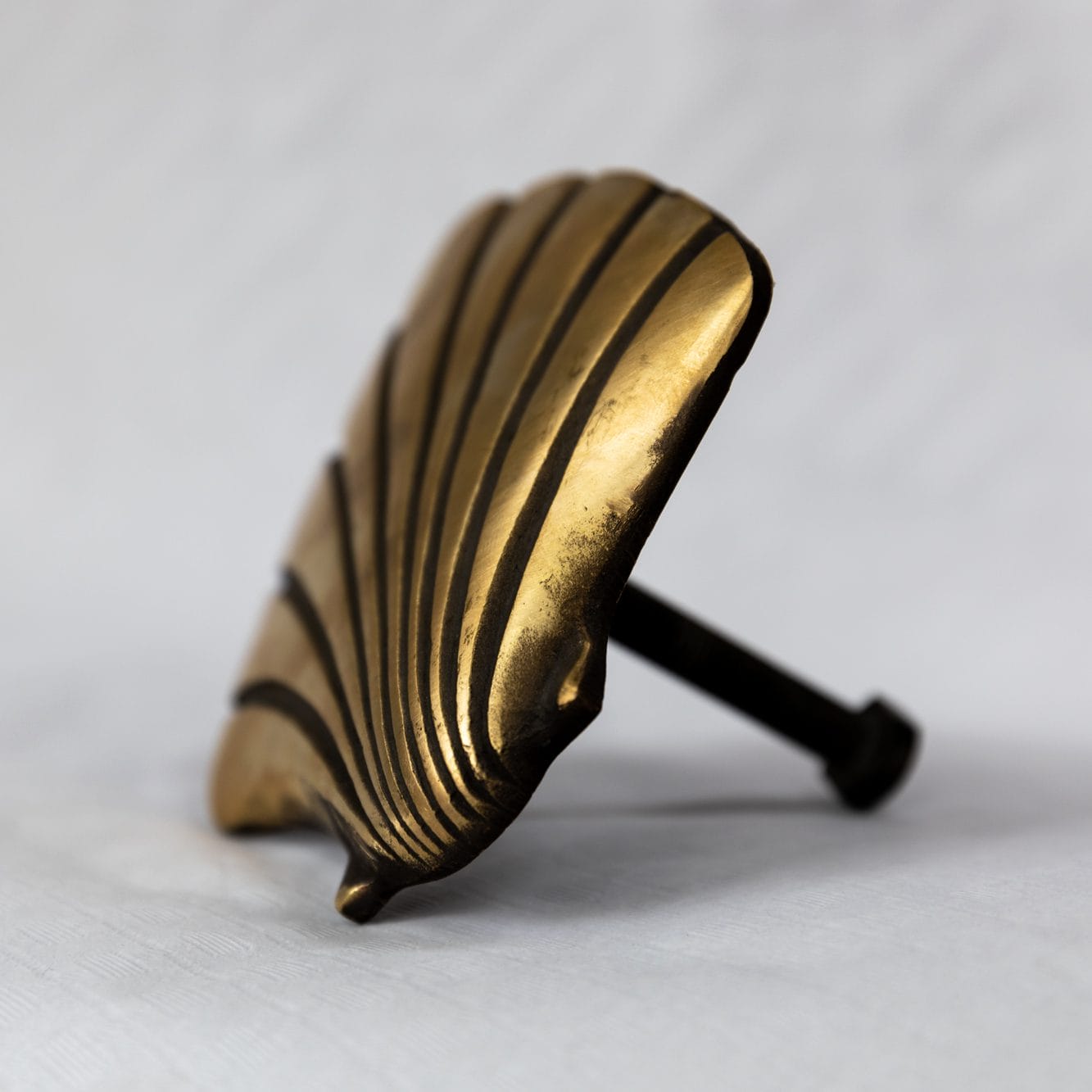 De stoepschelp werd gegoten in messing en is bovenaan gepolijst. De maximale dikte van de schelp bedraagt 1,3 cm. Onderaan de schelp werd een bout met kop gelast, lengte 8 cm en diameter van de bout 1 cm. De stoepschelp kan alzo veilig aangebracht worden in een pad of een muur.