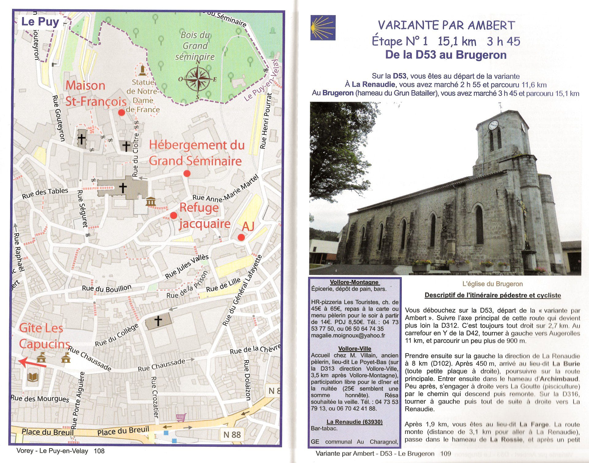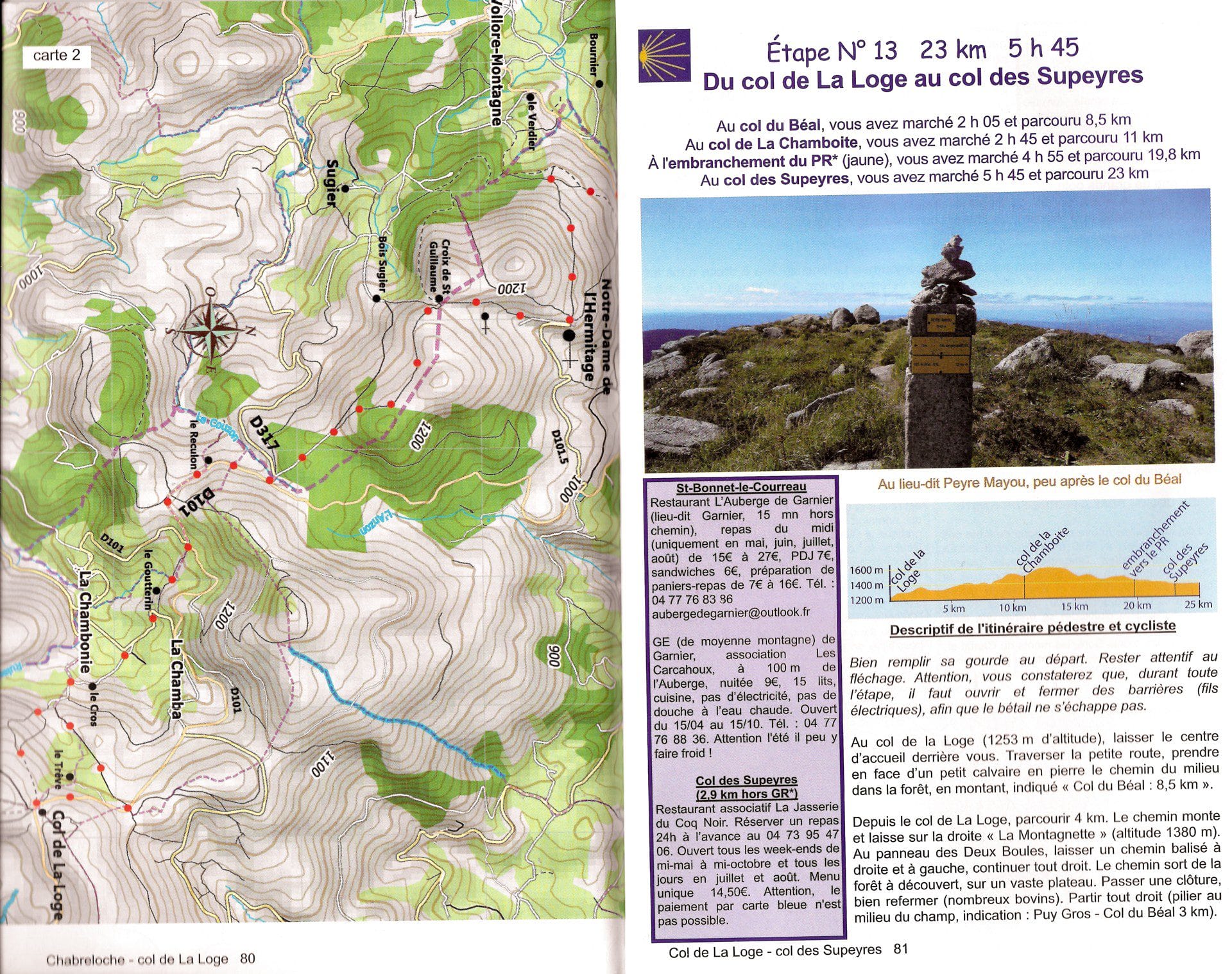 De gids beschrijft de route die vertrekt aan de basiliek van Sainte-Marie-Madeleine in Vézelay tot aan de kathedraal in Le Puy-en-Velay. De totale afstand bedraagt 452 km. De route volgt de GR 13 en de GR 3. De gids beschrijft ook een variante van Chabreloche tot Vorey. Deze variante blijft in de vallei, is dus gemakkelijker en korter. De totale afstand wordt dan 421 km. De gids somt per dorp de overnachtingsmogelijkheden en de winkels op. Daarnaast krijg je heel wat informatie over geschiedenis en cultuur. Voor elke etappe zijn afstand en nodige tijd aangegeven.