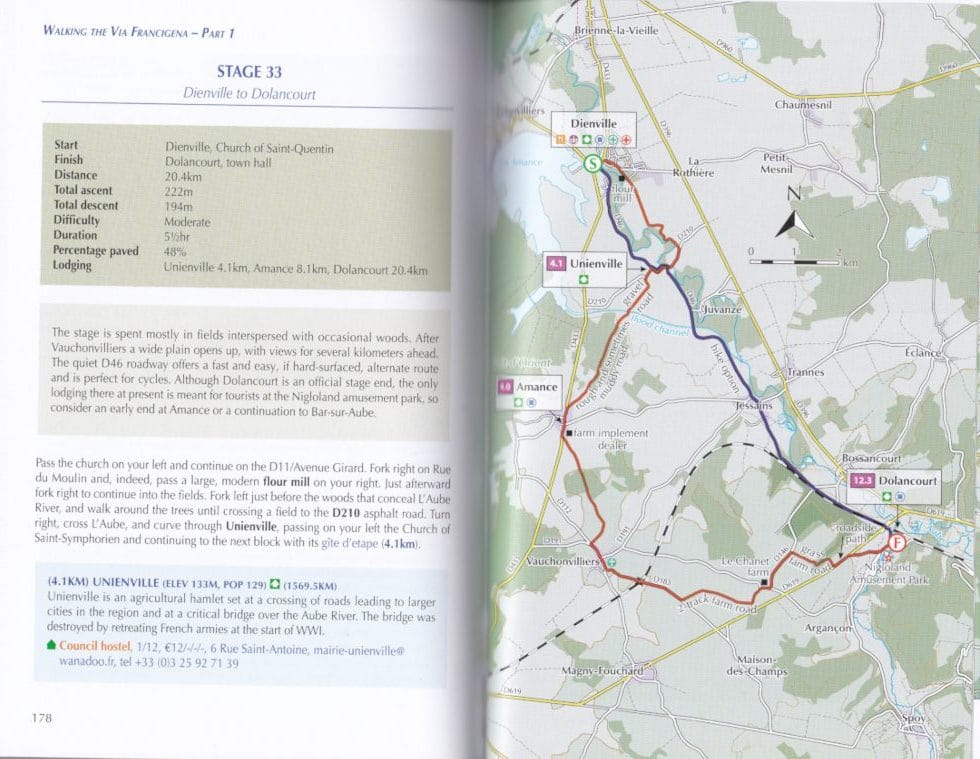 De gids Via Francigena geeft informatie over slaapgelegenheden en alles wat nuttig kan zijn voor de pelgrim, zoals eetgelegenheden, winkels, banken enzovoort. Daarbij ook beperkte toeristische informatie. Naast het traject voor de stappers is er ook een alternatieve route voor de fietsers voorzien.