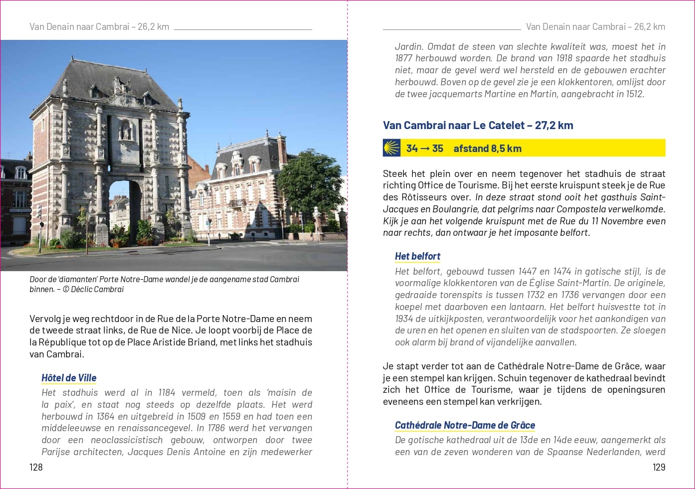 De Via Scaldea sluit in Vlissingen (NL) aan op de Jacobsweg Die Haghe. Door Zeeuws-Vlaanderen en het Meetjesland trek je naar Gent, met haar talrijke bezienswaardigheden twee bezoekdagen waard. Na de gezellige stadsdrukte struin je langs oude Scheldearmen, die zich omtoverden tot natuurgebieden. Na een korte zijsprong naar Ename steek je de Schelde over naar het mooie Oudenaarde. Dan komt Doornik in zicht, de op een na oudste stad van België. In Saint-Amand-les-Eaux kun je de verbazingwekkende abdijtoren bewonderen. Daarna stap je over de beroemde wielerkasseien van de Arenbergtrog. Verderop ligt de bisschopsstad Cambrai met haar rijke cultuurpatrimonium. Je pad loopt verder langs de cisterciënzerabdij van Notre-Dame de Vaucelles en eindigt aan basiliek van Saint- Quentin.